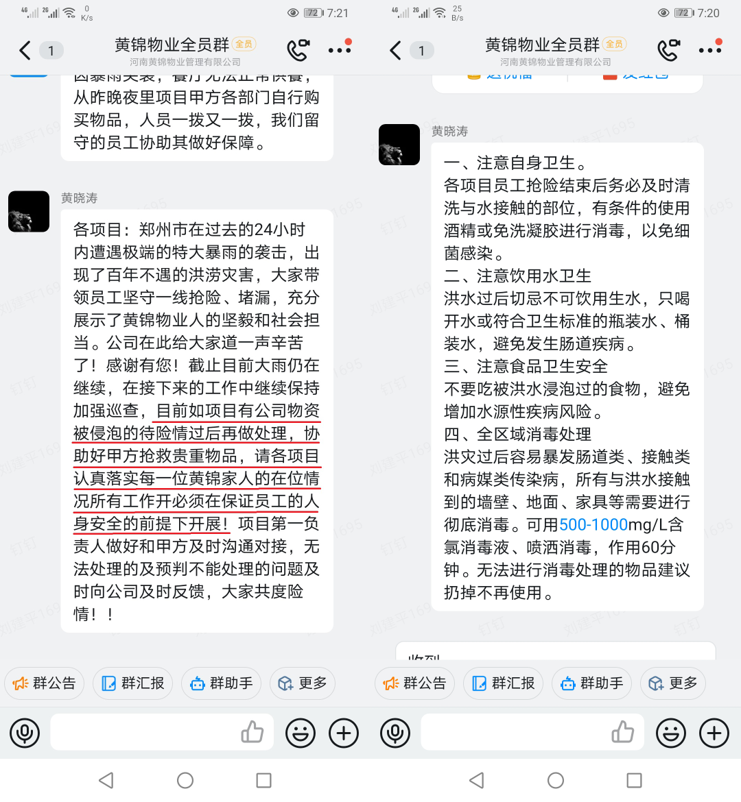 暴雨持續,全體黃錦人仍奮戰在防汛救災第一線,抗洪取得了階段性成果,一場“防疫”阻擊戰正在上演!確保每一個洪水肆虐過的地方,都有我們消殺的足跡,用黃錦人的堅持和責任換回美好河南、美好鄭州!